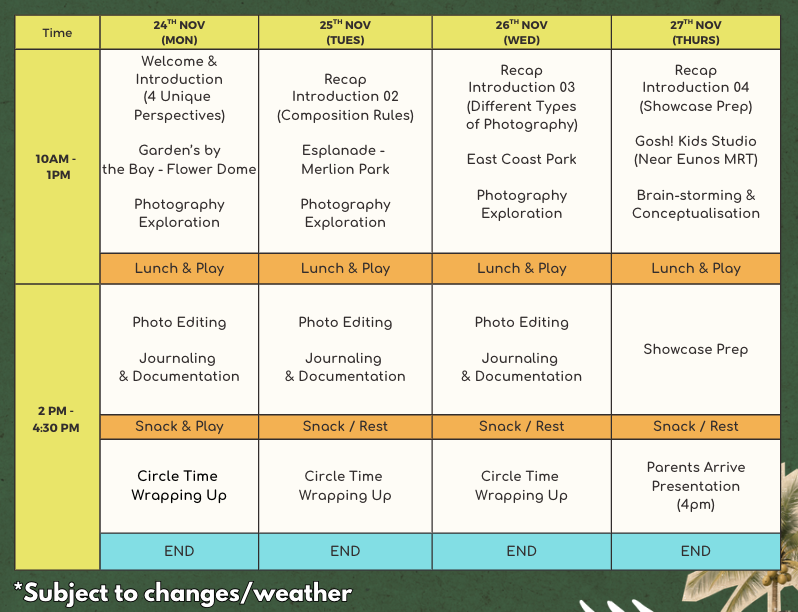 We’ll wander through the stunning blooms at Gardens by the Bay, spot creative lines and patterns at Esplanade, chase light and shadows by the sea at East Coast Park, and wrap it all up with a special Showcase at the Gosh! Kids Studio!