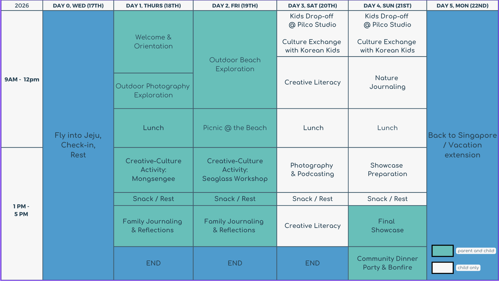 This June holidays, join us in Jeju, South Korea, for our overseas creative-cultures camp designed for families to unleash creativity, build cross-cultural relationships, connect with nature, and broaden their perspective of the world.