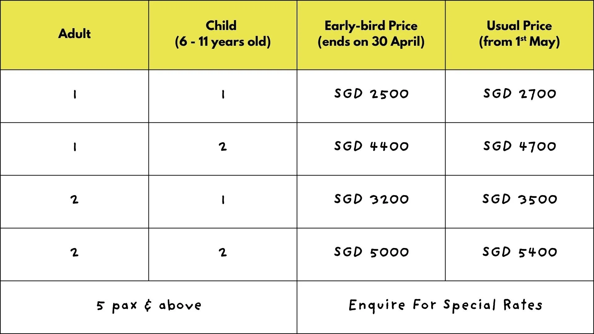 An additional fee of SGD 30 / pax will be collected for non-participating children (below 6yo) / parents for community dinner night