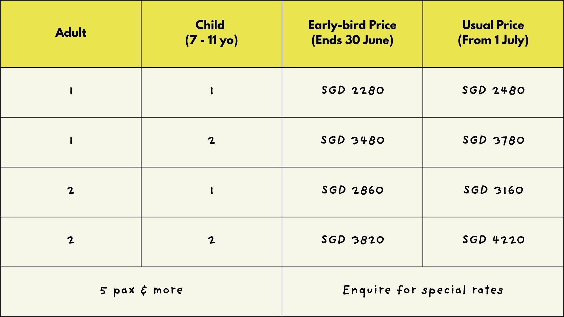 If you or your family members have any dietary restrictions or allergies, do let us know in the enrollment form and we will do our best to accommodate their needs.