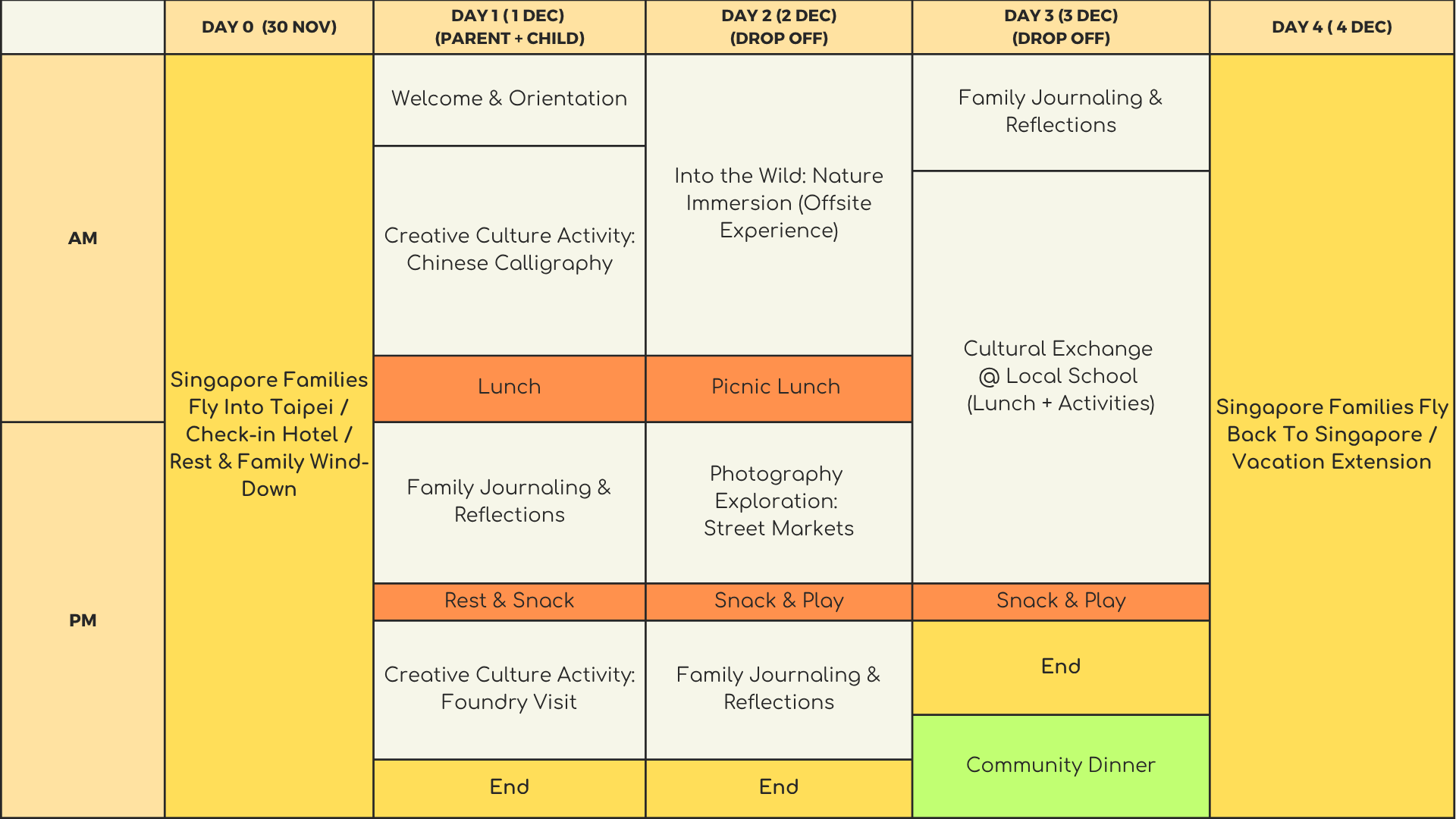 There are benefits in exploring fresh and new frontiers. Families can learn effectively about the world and discover their creative identities by experiencing novel and foreign expressions. Through our overseas creative-culture camps, we want to bridge the world into their lives, and reconnect ourselves to what’s most important - each other